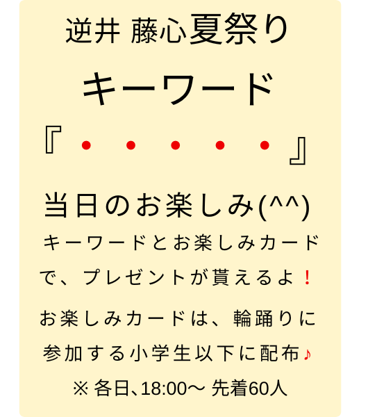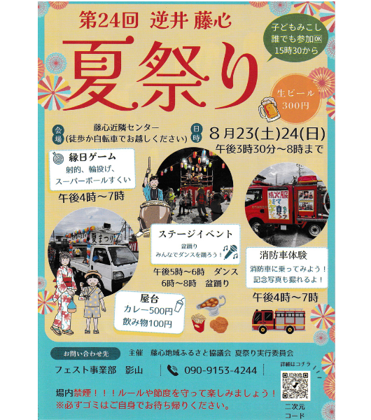 8/23・24 逆井藤心夏祭りを開催しています! 夏祭りの詳細は下のポスターをクリック👆 8/24キーワード公開中!